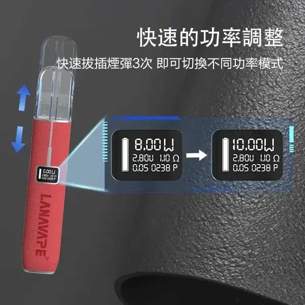 3. 切換功率模式:在LANA主機啟動狀態下,快速完成「拔出並插入煙彈」的動作兩次,螢幕上的功率數字會隨之切換。